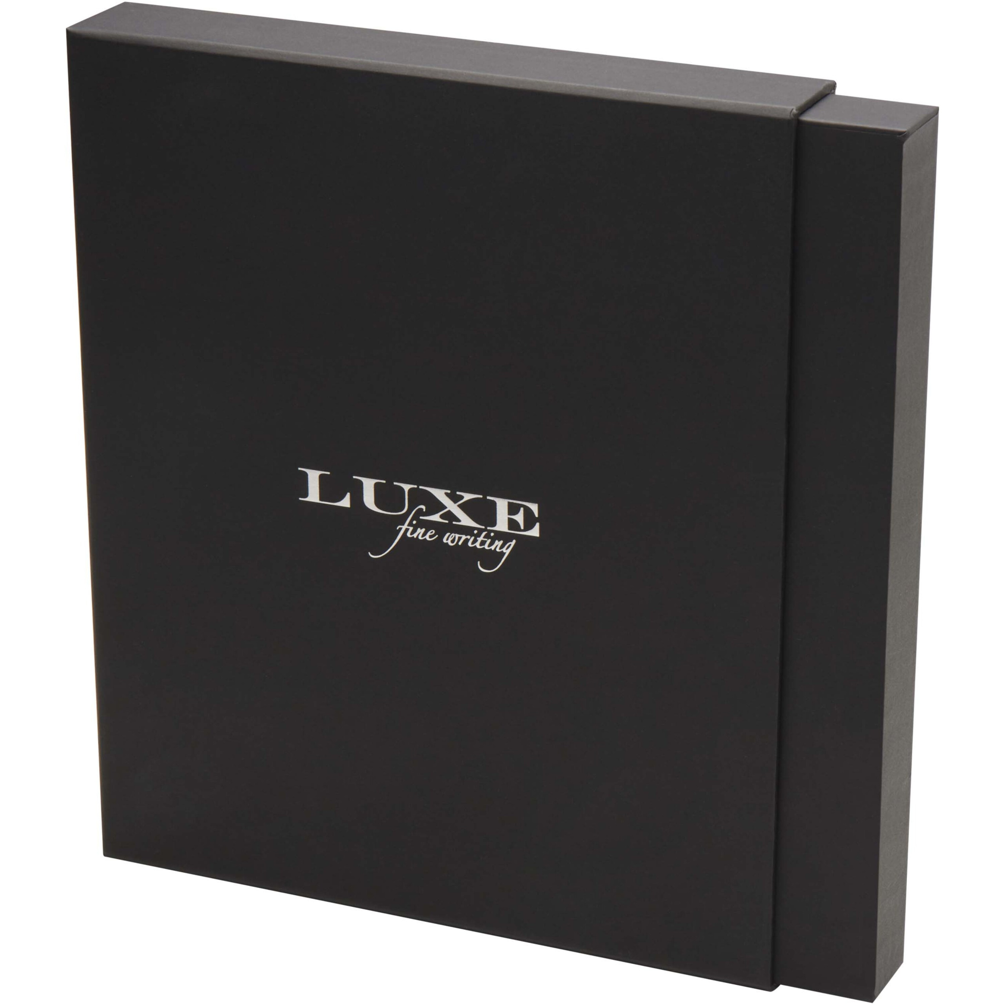 Setet Legato är en elegant kombination av en A5-anteckningsbok och en kulpenna. Pennan har en pennkropp av RCS-certifierad återvunnen mässing med silverkromad finish, färgad spraylackering, silverkromade metalldetaljer och en LUXE-logga på mittringen. Bläckfärg: Blå. Skrivlängd: 400 meter. NIB-storlek: 0,7 mm. Extra påfyllning i svart färg ingår. Anteckningsboken har 80 ark 80 g/m² linjerat krämfärgat papper och ett omslag av återvunnen plast, elastisk förslutning, markeringsband och dragspelsficka. Silverkromat metalltillbehör på den elastiska stängningen. Den levereras i en presentförpackning.
