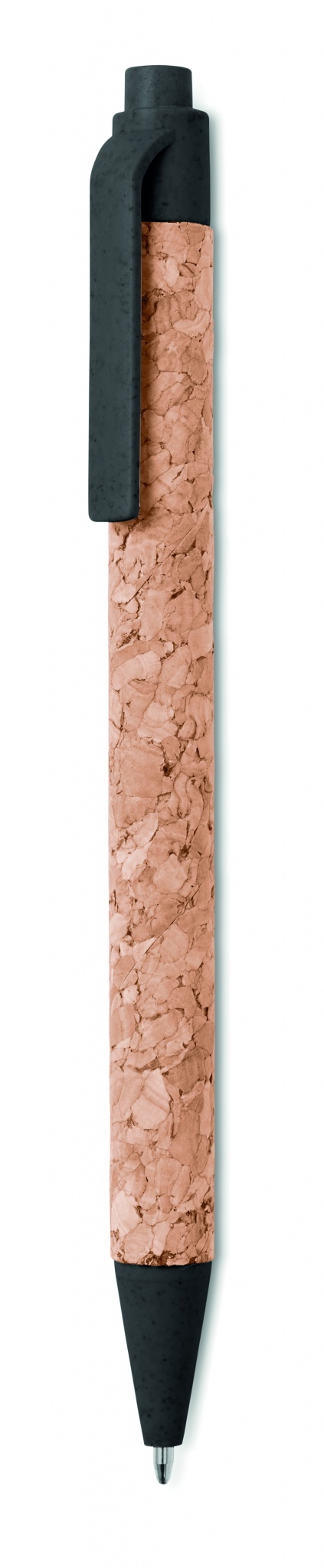 Kulspetspenna i korkmaterial och detaljer i vete/halm (50%) och PP plast (50%). Blått bläck.