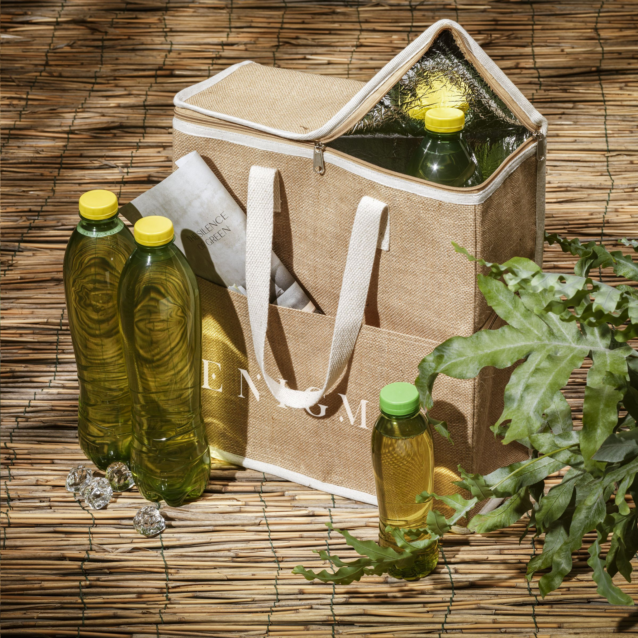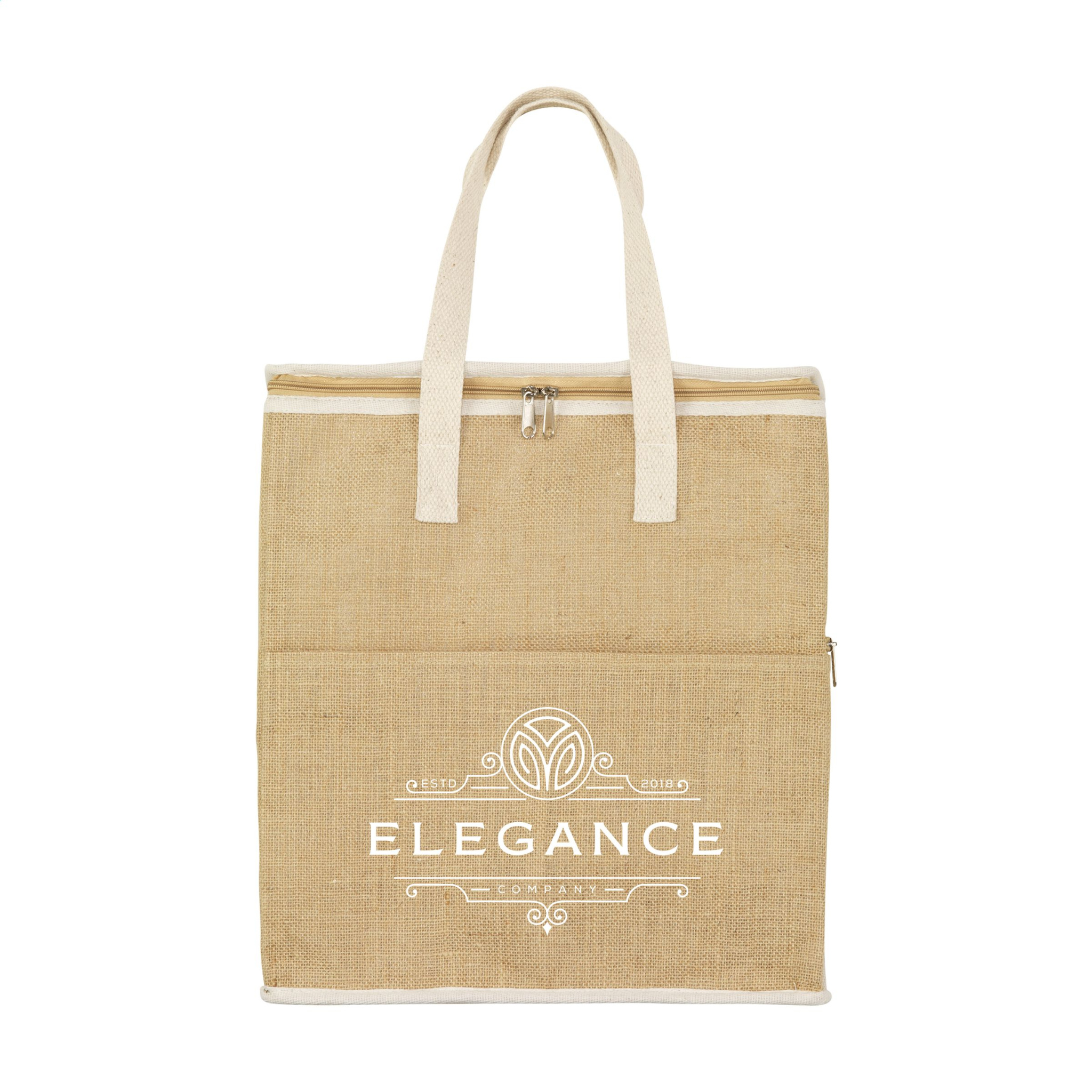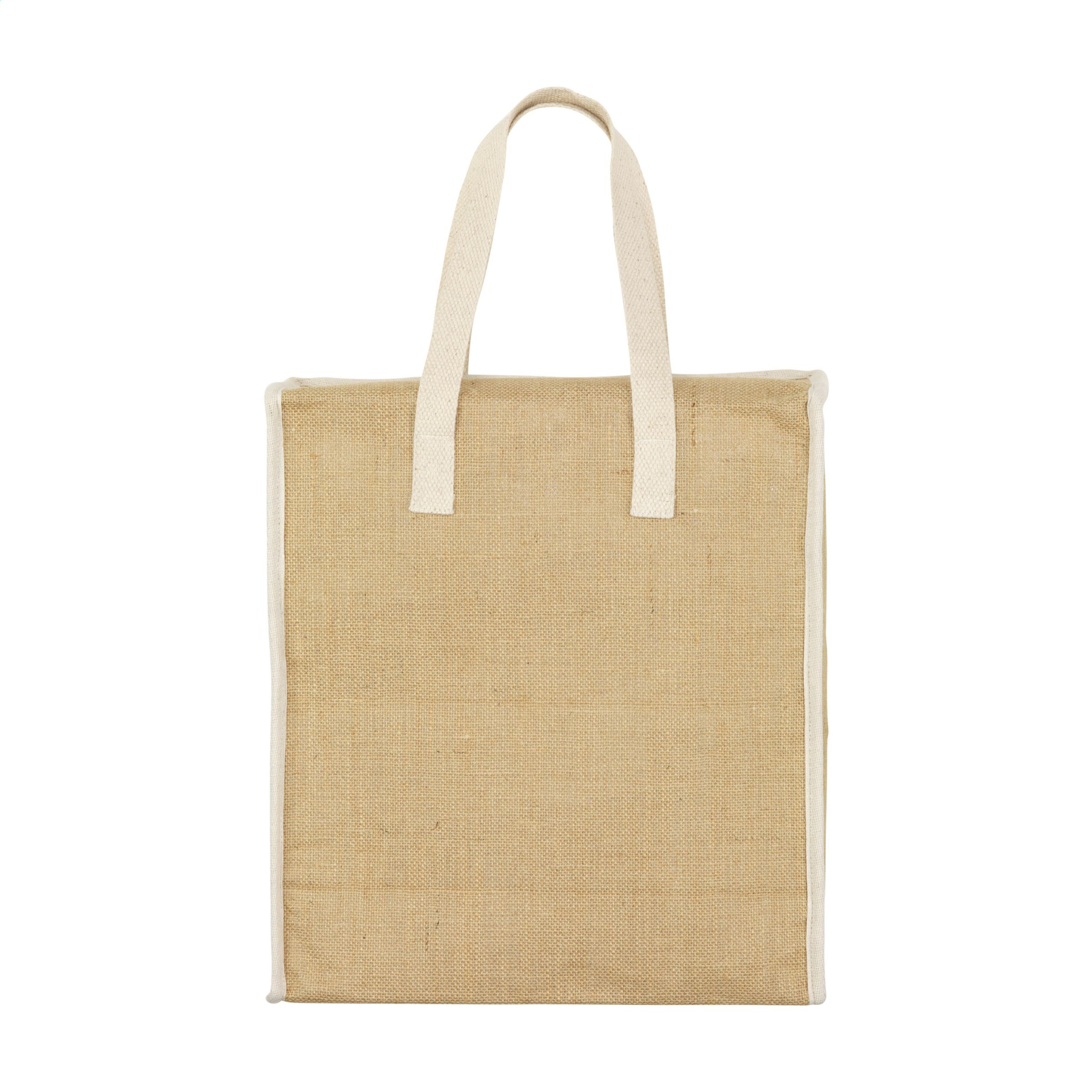 WoW! Denna kylväska tillverkad av en kombination av kraftigt jute- och bomullsmaterial med isolerad insida. Håll din mat och dryck sval under en dag ute i denna mycket rymliga kylväska. Denna väska har en dragkedja och en framficka som ger extra förvaringsutrymme. Dessa extra fickor är praktiska för att förvara saker som inte behöver kylas, som din telefon eller plånbok. Levereras med handtag av vävd bomull. Kapacitet ca. 24 liter.