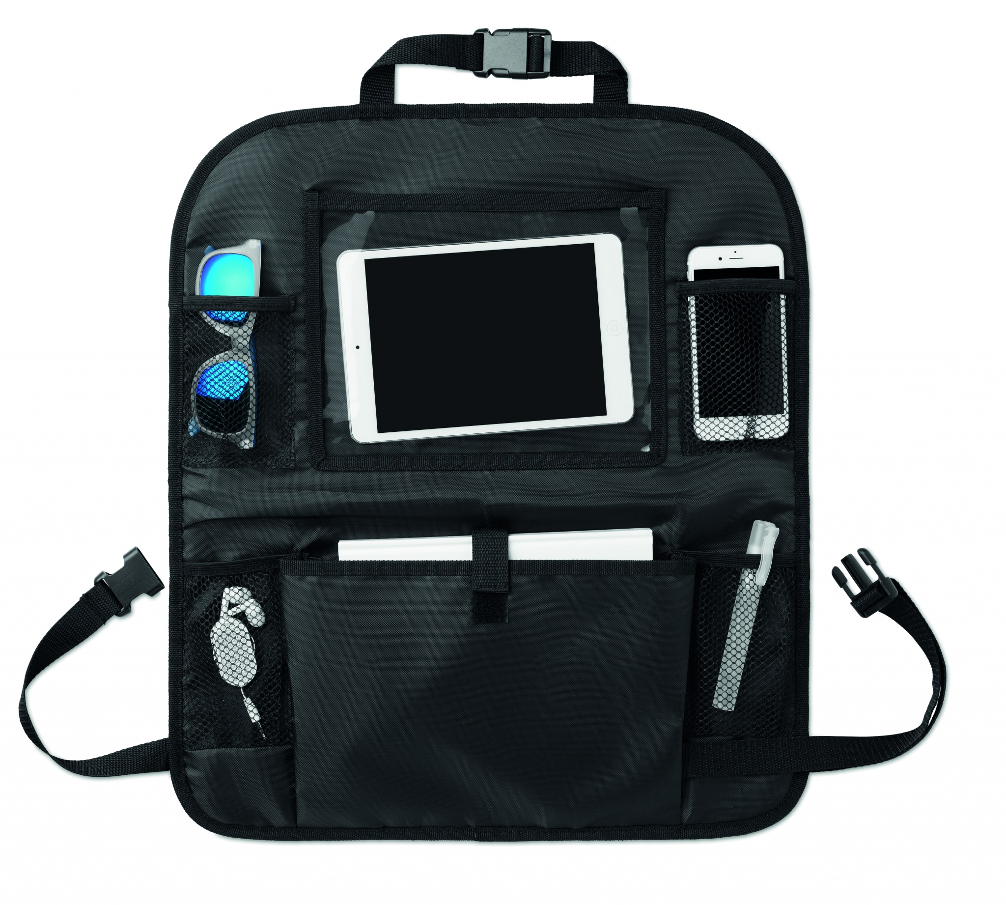 Bilsätes organisatör i 600D Polyester med flera praktiska fack, bl.a. för Ipad och telefonen. Förutom att förvara artiklar skyddar den bilsätet mot smutsiga barnskor.