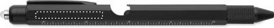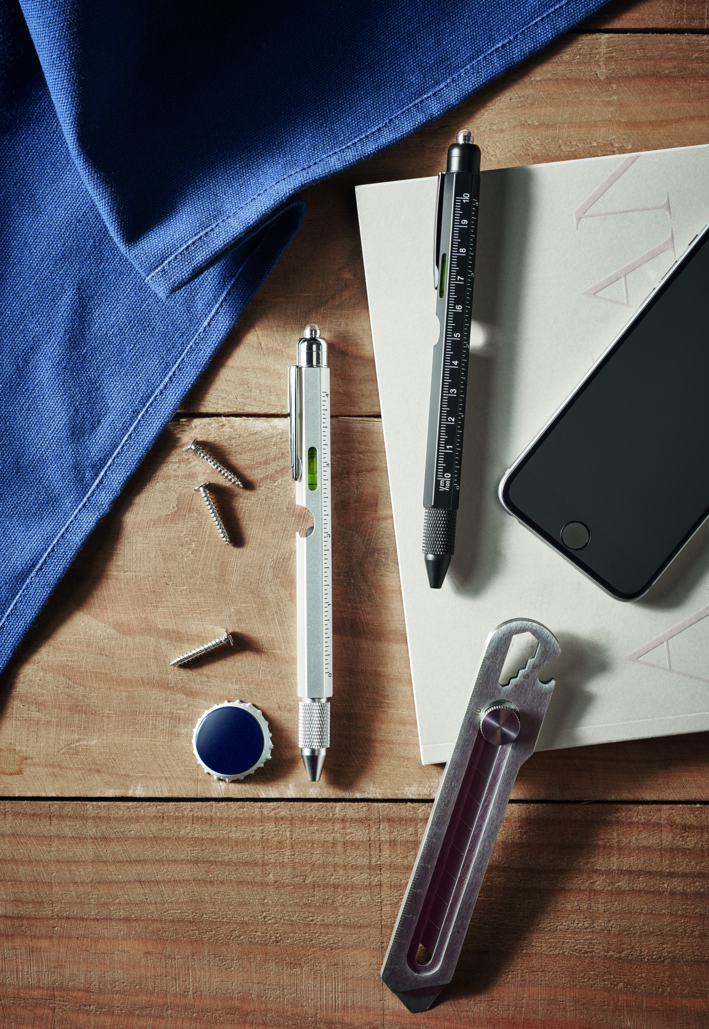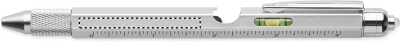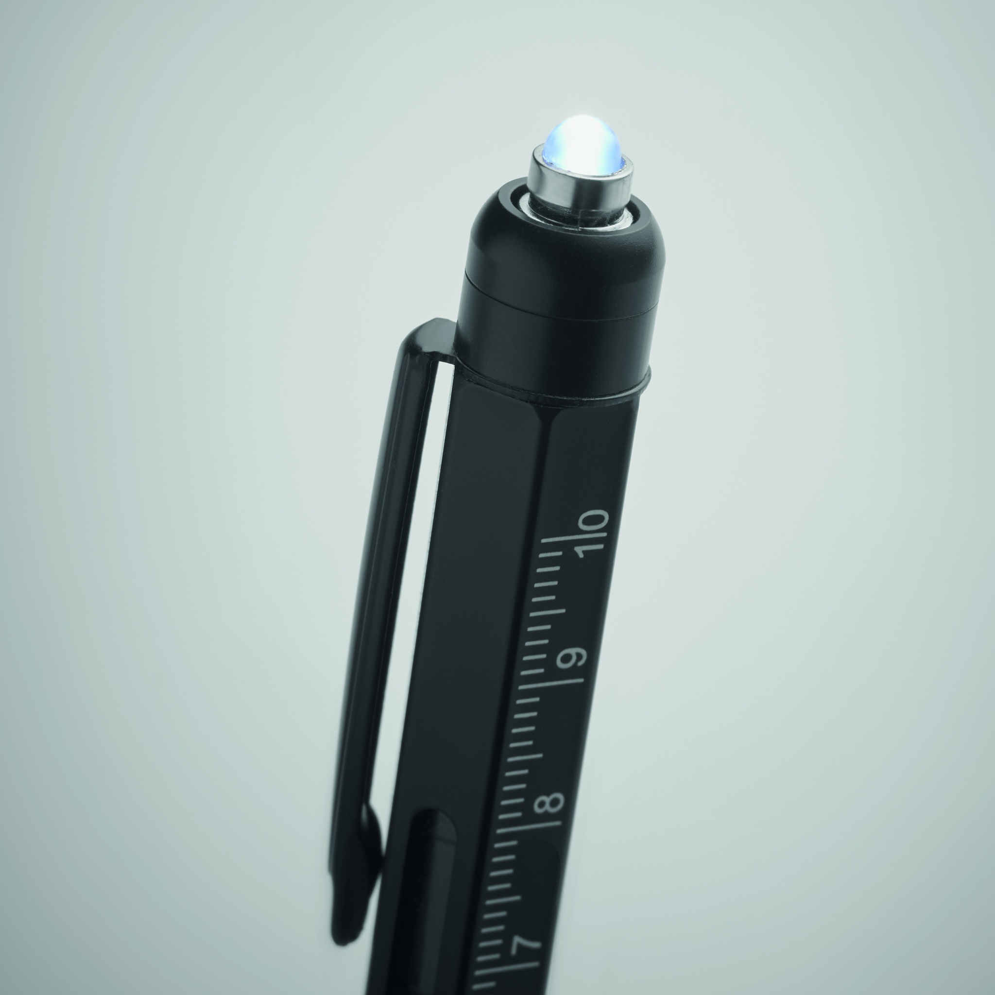 Penna med vridfunktion i rostfritt stål med linjal, vattenpass, bits för skruvmejslar med phillips- och flatheadskruvmejslar samt lysdiod. 3 AG-batterier ingår. Blått bläck.