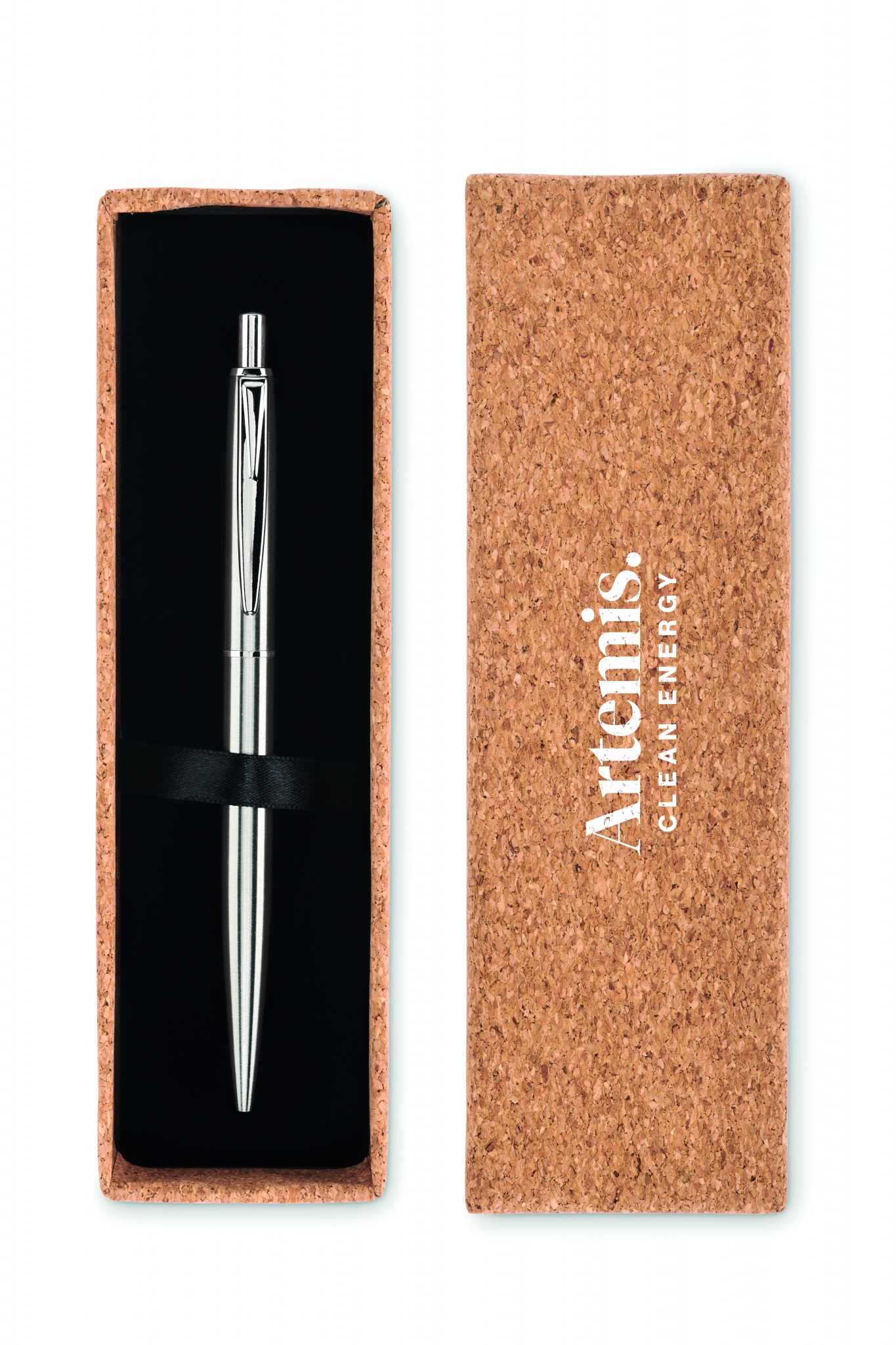 Kulspetspenna med tryckknapp i återvunnet rostfritt stål. Presenteras i matchande korkbox. Blått bläck.