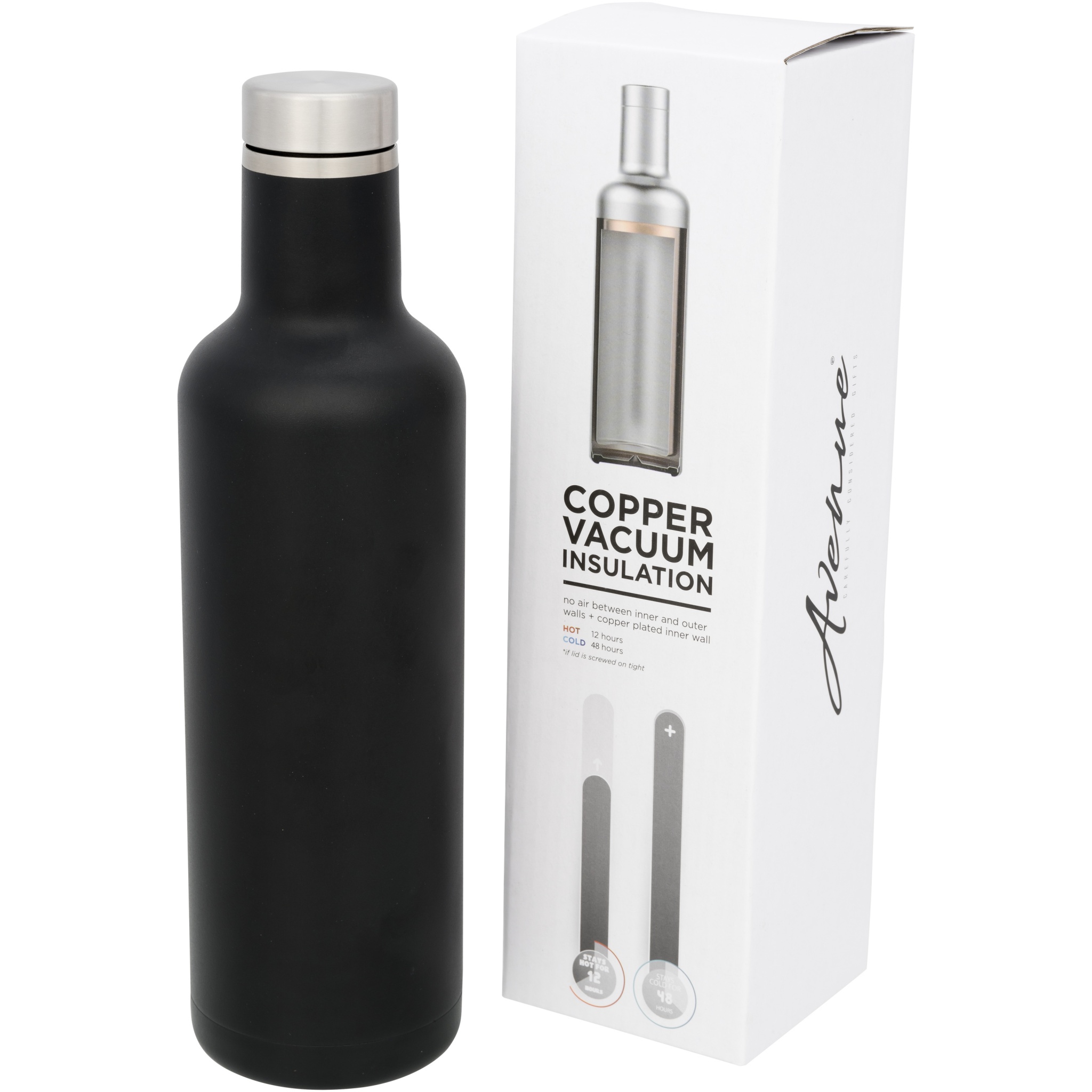 Pinto kopparvakuumisolerad termosflaska. Håller din dryck varm i 12 timmar eller kall i 48 timmar. Rostfritt stål med tålig dubbelväggskonstruktion och kopparisolering. Konstruktionen hindrar också att kondens utvecklas på utsidan. Skruvkork. Spraypulverlack på det yttre kroppshöljet. Volym 750 ml. Avenue presentförpackning. Rostfritt stål.