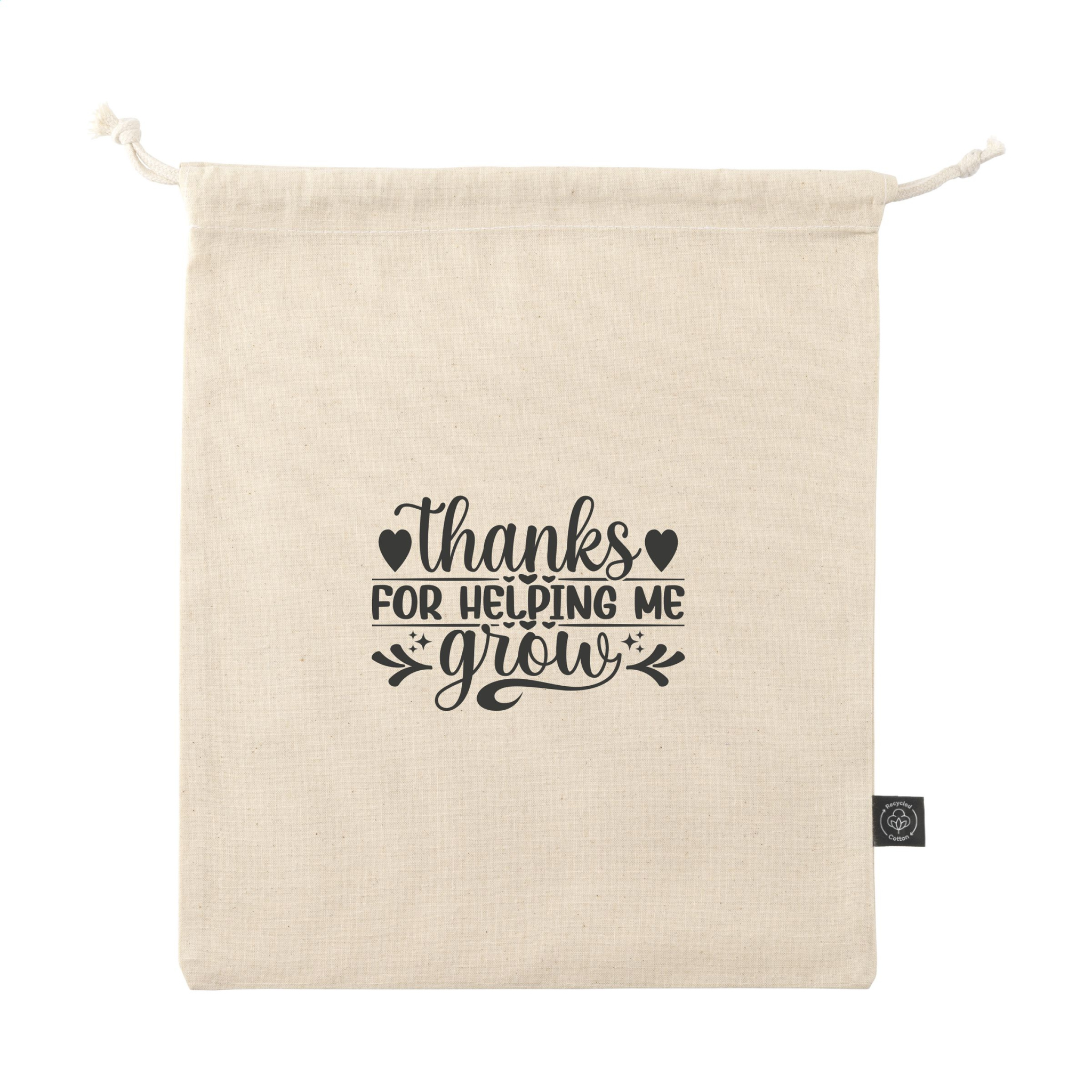 Presentpåse tillverkad av återvunnen bomull (150 g/m²). Med dragsko av återvunnen polyester och återvunnen bomull. Original som presentförpackning och lämplig för förvaring av föremål. GRS-certifierad. Totalt återvunnet material: 95 %. Kapacitet ca. 1,5 liter.