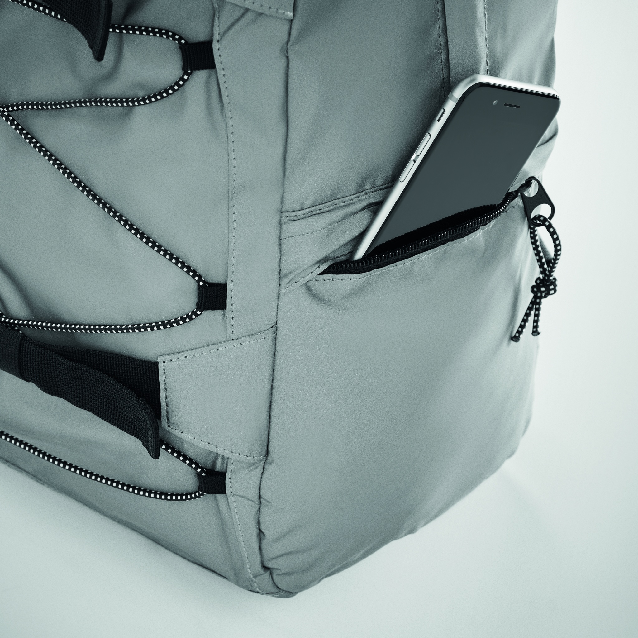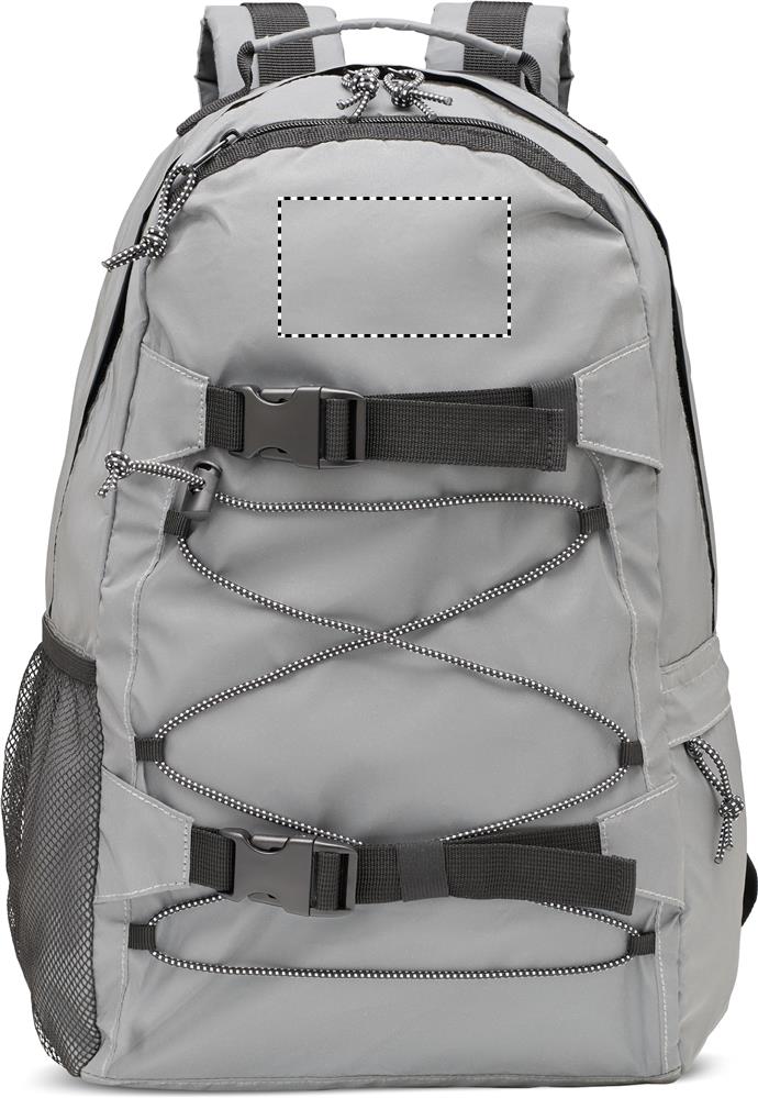 Ryggsäck i högreflekterande 190T polyester med snöre på framsidan. Vadderad rygg, remmar och botten. Den har ett fack för 15'' bärbar dator. En nätficka på ena sidan och en ficka med dragkedja på den andra sidan.