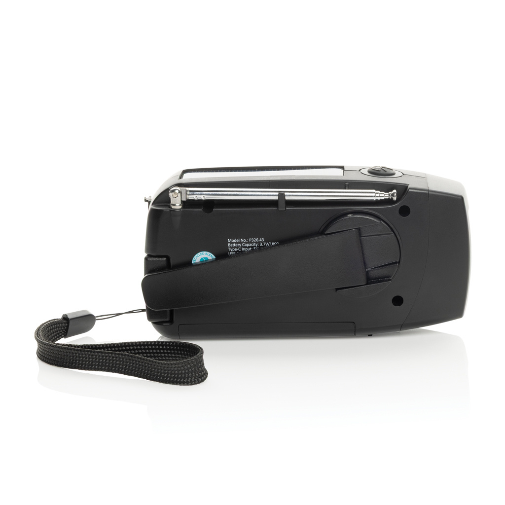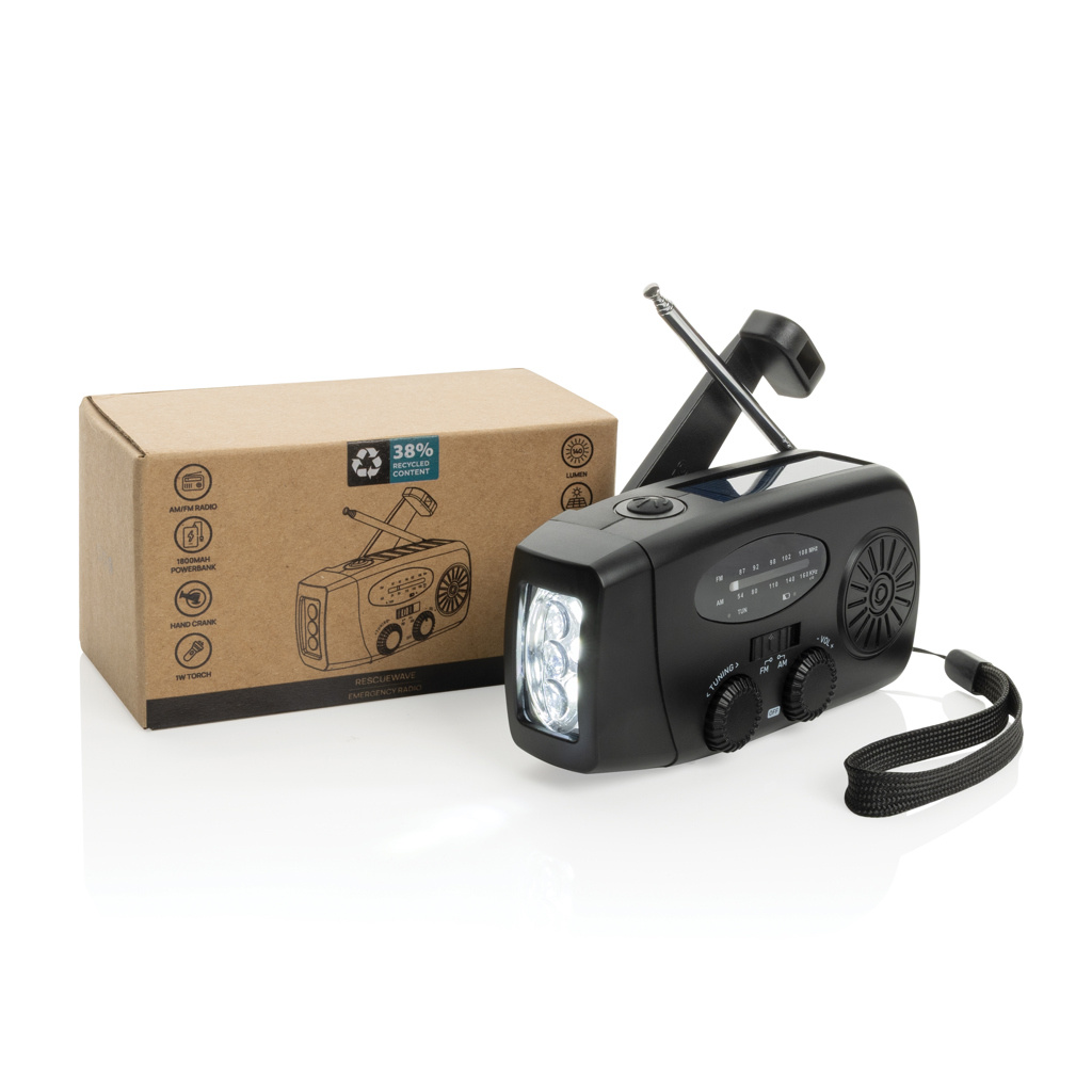 Var beredd på alla situationer med RescueWave, en mångsidig nödradio som är utformad för att hålla dig uppkopplad och strömförsörjd. Med AM/FM-radio, solpanel, en integrerad 1W-fackla, USB-utgång och USB C-ingång ser den här kompakta enheten till att du är utrustad för oväntade ögonblick. Med ett inbyggt 1800mAh-batteri kan RescueWave laddar du din telefon enklet. Handvevsmekanismen ger pålitlig funktion - bara 1 minuts vevning ger 5 minuters radio eller 30 minuters ficklampa, vilket gör den till ett viktigt verktyg i nödsituationer. När radion är fulladdad klarar den upp till 15 timmars radiosändning eller 8 timmars ficklampsljus. Tillverkad av RCS-certifierade återvunna material, inklusive återvunnen ABS-plast. RCS (Recycled Claim Standard) är en standard för att verifiera det återvunna innehållet i en produkt genom hela leveranskedjan. Totalt återvunnet innehåll: 38% baserat på artikelns totala vikt. Artikel och tillbehör är PVC-fria och förpackade i FSC®-förpackningar.