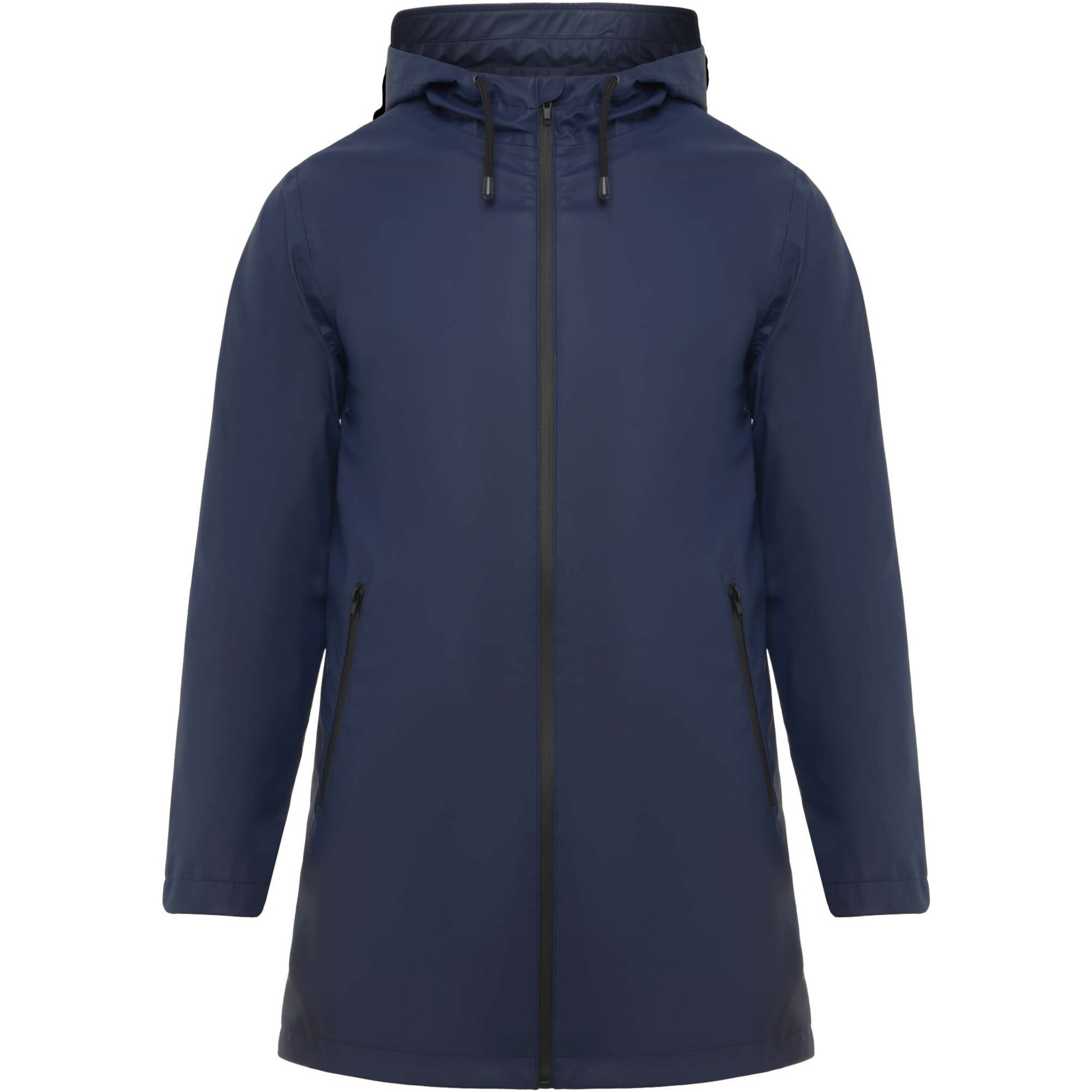 Vattentät regnjacka. Huva med topp. Värmeförseglade dragkedjor och sömmar. Kontrasterande detaljer i svart. Två sidfickor med dragkedja. Slits i bakre fållen. Borttagbar etikett. Vattentät. Modellen är 185 cm och bär storlek M.