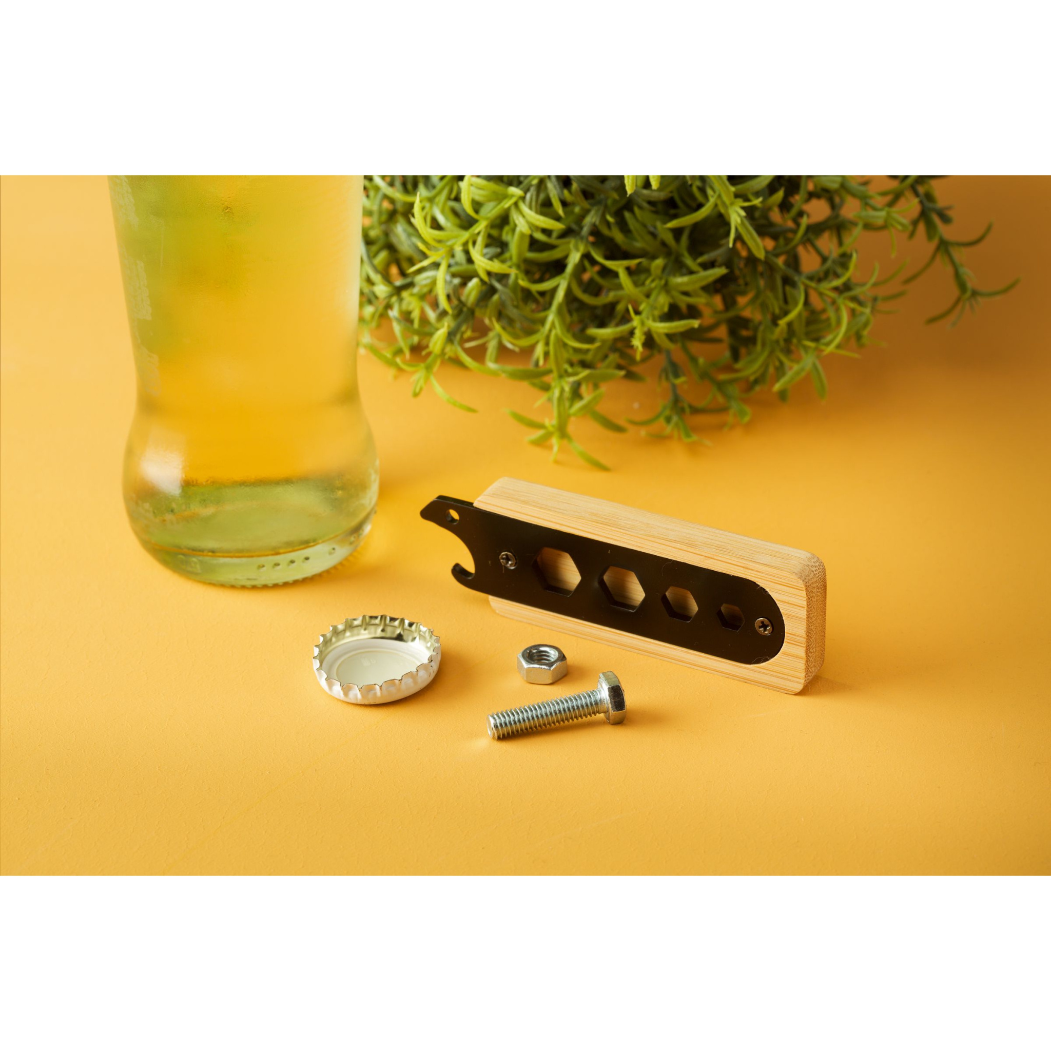 Behändigt multiverktyg med flasköppnare i rostfritt stål med bambuhandtag och 4 platta skiftnycklar i olika storlekar.
