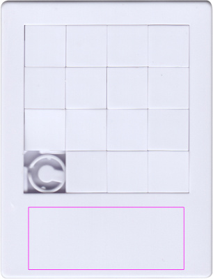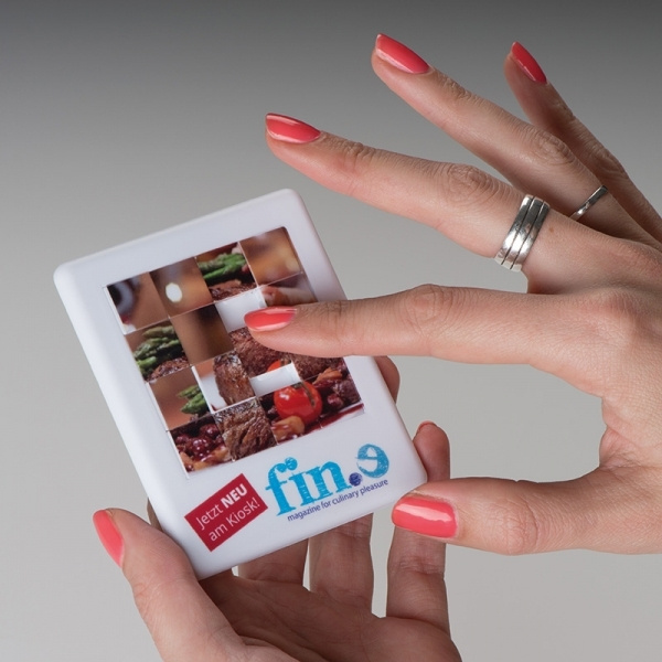 Plast glidande pusselspel med 15 bitar och en propp. Vi trycker din logotyp överallt med digitaltryck.