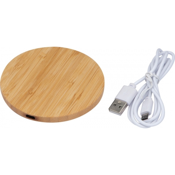 Rund trådlös laddare i bambu med laddningskabel, lämplig för alla QI-aktiverade smarta telefoner. Vi kommer att placera din logotyp på laddaren.
