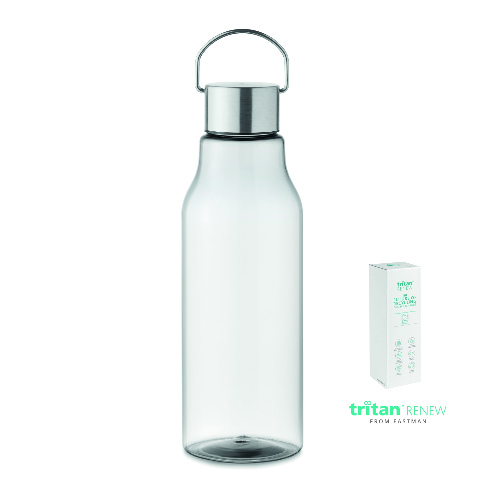 Flaska i Tritan Renew™ som är BPA-fri med lock med handtag i rostfritt stål. Läckfri. Volym: 800 ml. Denna produkt är framställd av 50 % plastavfall med hjälp av ISCC-certifierad massbalans.