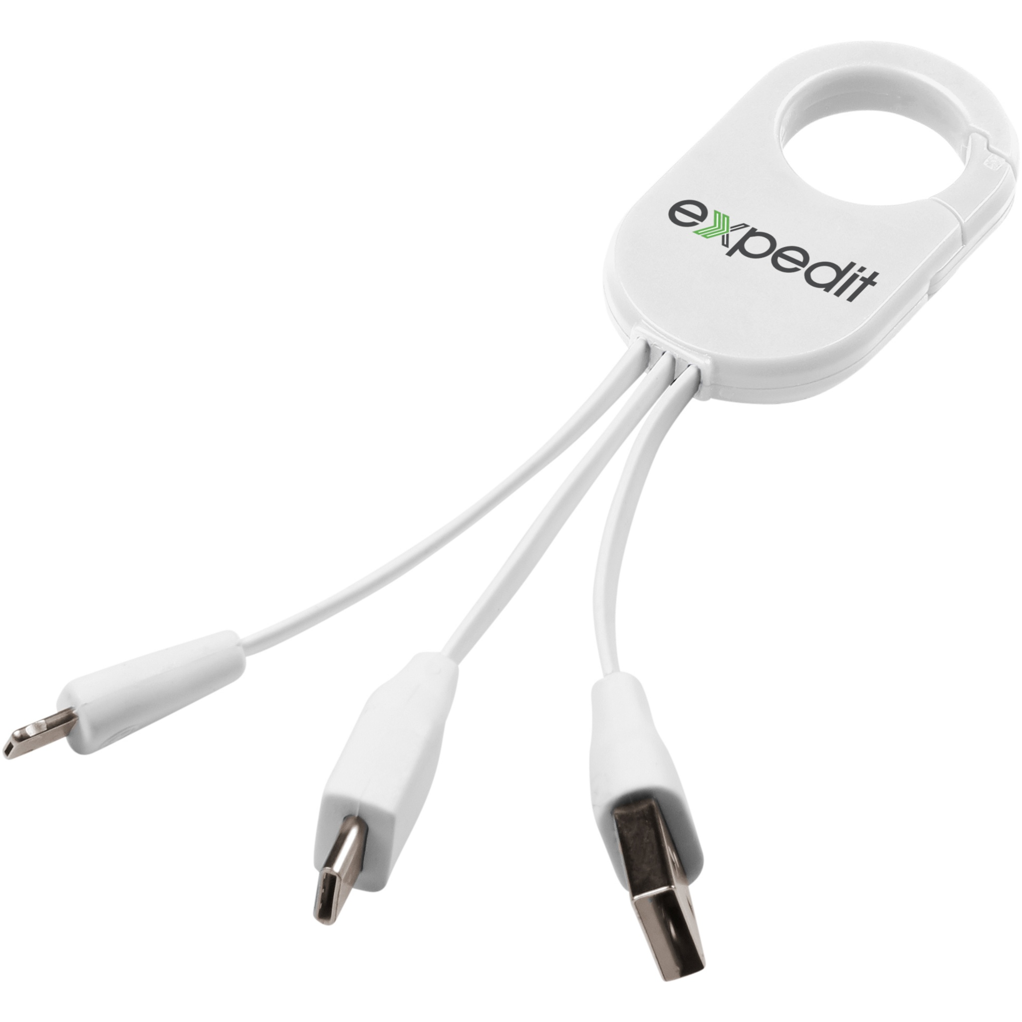 Troop 3-i-1 laddningskabel. The Troop 3-i-1 laddkabel har en USB C-kontakt och en 2-i-1 dubbelkontakt, kompatibel med både Apple® iOS- och Androidenheter. Levereras med karbinhake som enkelt kan fästas i din väska eller ryggsäck. ABS-plast.